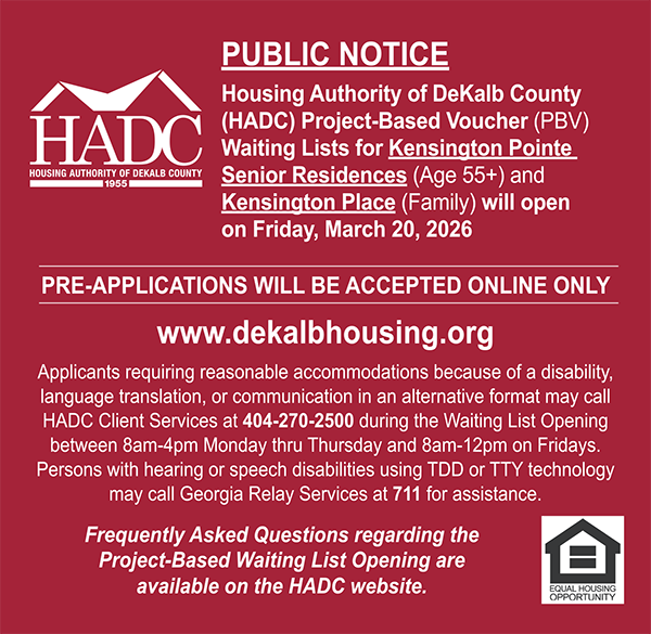 Housing Authority of DeKalb County (HADC) Project-Based Voucher (PBV) Waiting List for Starnes Senior Residences (Elderly Age 62+) will open on Friday, December 5, 2025. The waitlist will close on Friday, January 2, 2026.